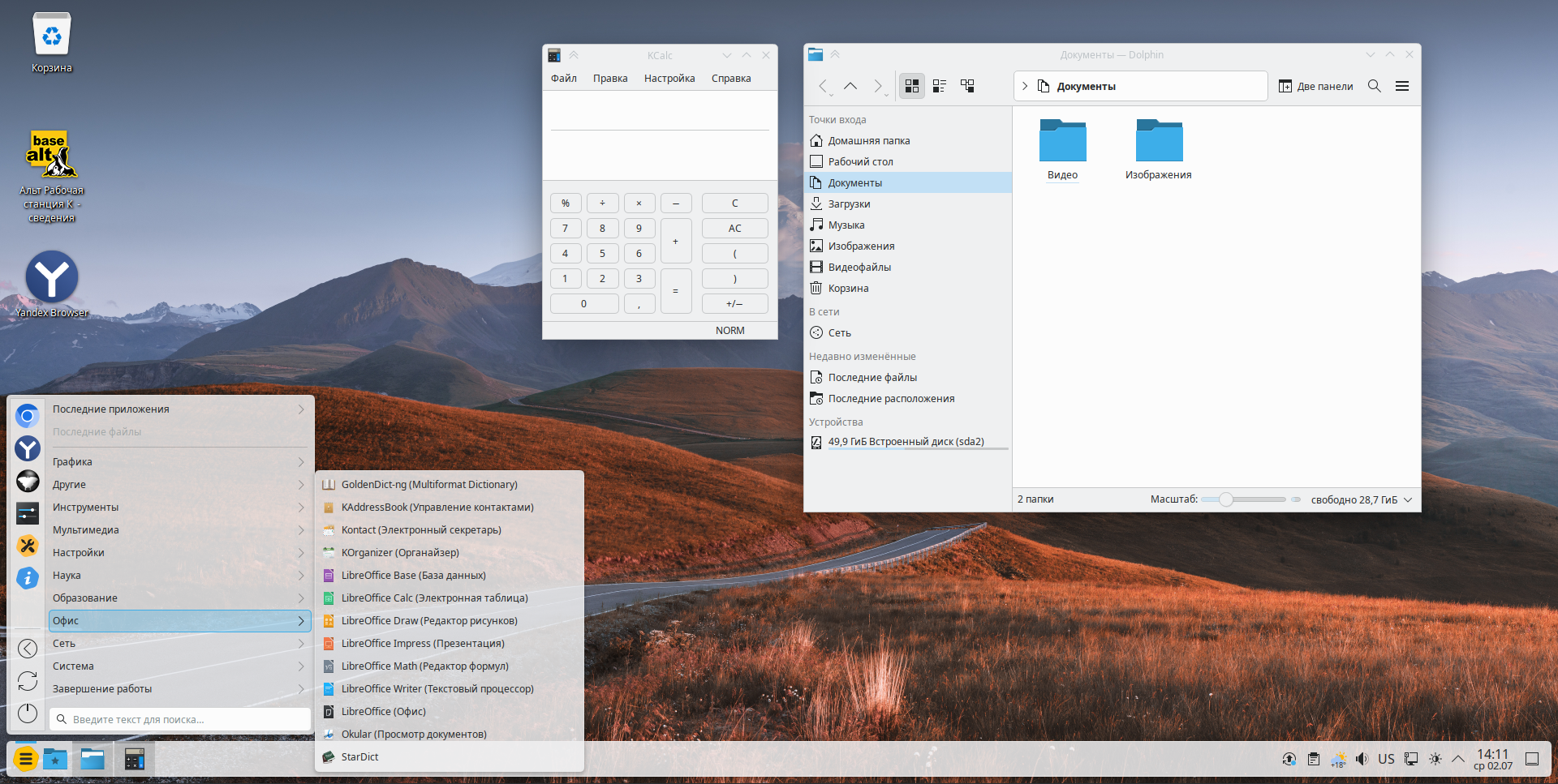 В «Альт Рабочей станции K» 11 по умолчанию используется современная графическая платформа Wayland, которая обеспечивает более эффективное использование системных ресурсов и повышенную безопасность. В рамках обновления реализован переход на KDE Plasma 6.3, Frameworks 6.12 и Gear 24.12, что включает в себя новый современный графический интерфейс.