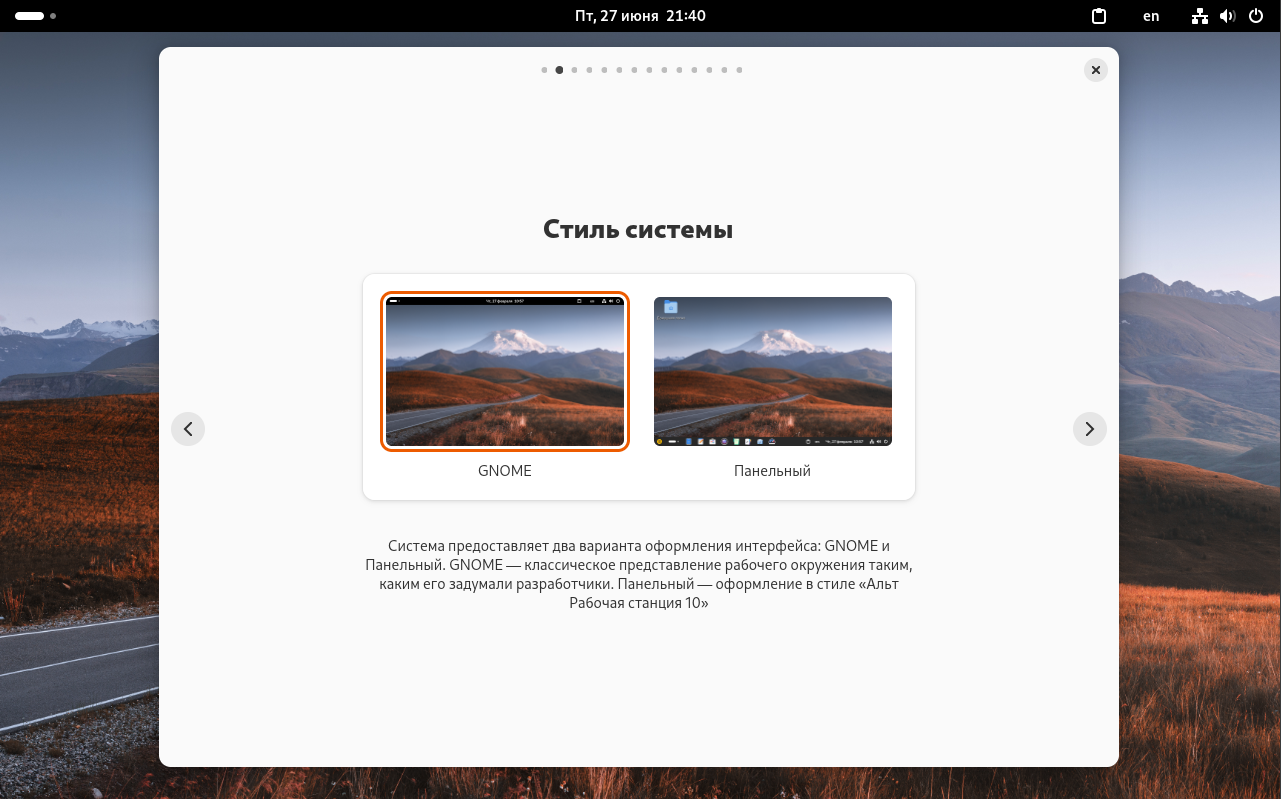 Система представляет два варианта оформления интерфейса: GNOME и Панельный. GNOME - классическое представление рабочего окружения таким, каким его задумали разработчики. Панельный - оформление в стиле «Альт Рабочая станция 10». Для следующей работы рекомендуется оставить панельный стиль оформления.